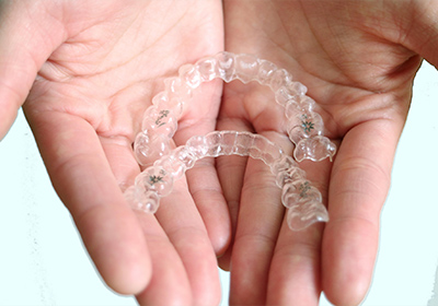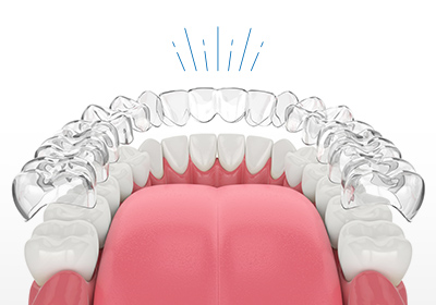 マウスピース矯正(インビザライン)とは、透明のマウスピース型矯正装置を着用することで、少しずつ歯並びを整えていく治療方法です。マウスピースはプラスチック素材でできているため装着時の違和感が少なく、透明なので周囲から気付かれにくいです。世界的に多くのかたに選ばれている治療法で、治療実績も豊富なのでご安心ください。